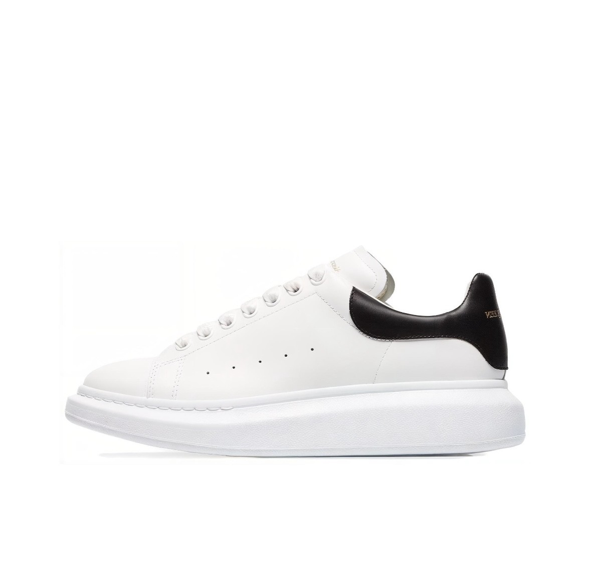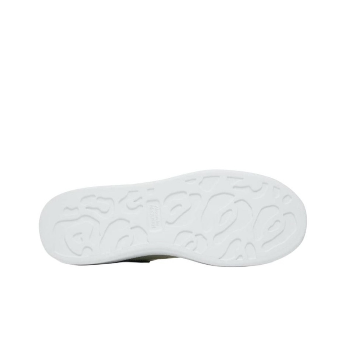 滑らかなホワイトのカーフレザー製のレースアップスニーカーです。ラウンドトゥで、かかとがブラックのスエードで縁取られています。幅広のフラットなシューレースで、タンとヒールカウンターにはAlexander McQueenのロゴ入りです。ソールはオーバーサイズのラバーソールです。